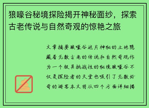 狼嚎谷秘境探险揭开神秘面纱,探索古老传说与自然奇观的惊艳之旅